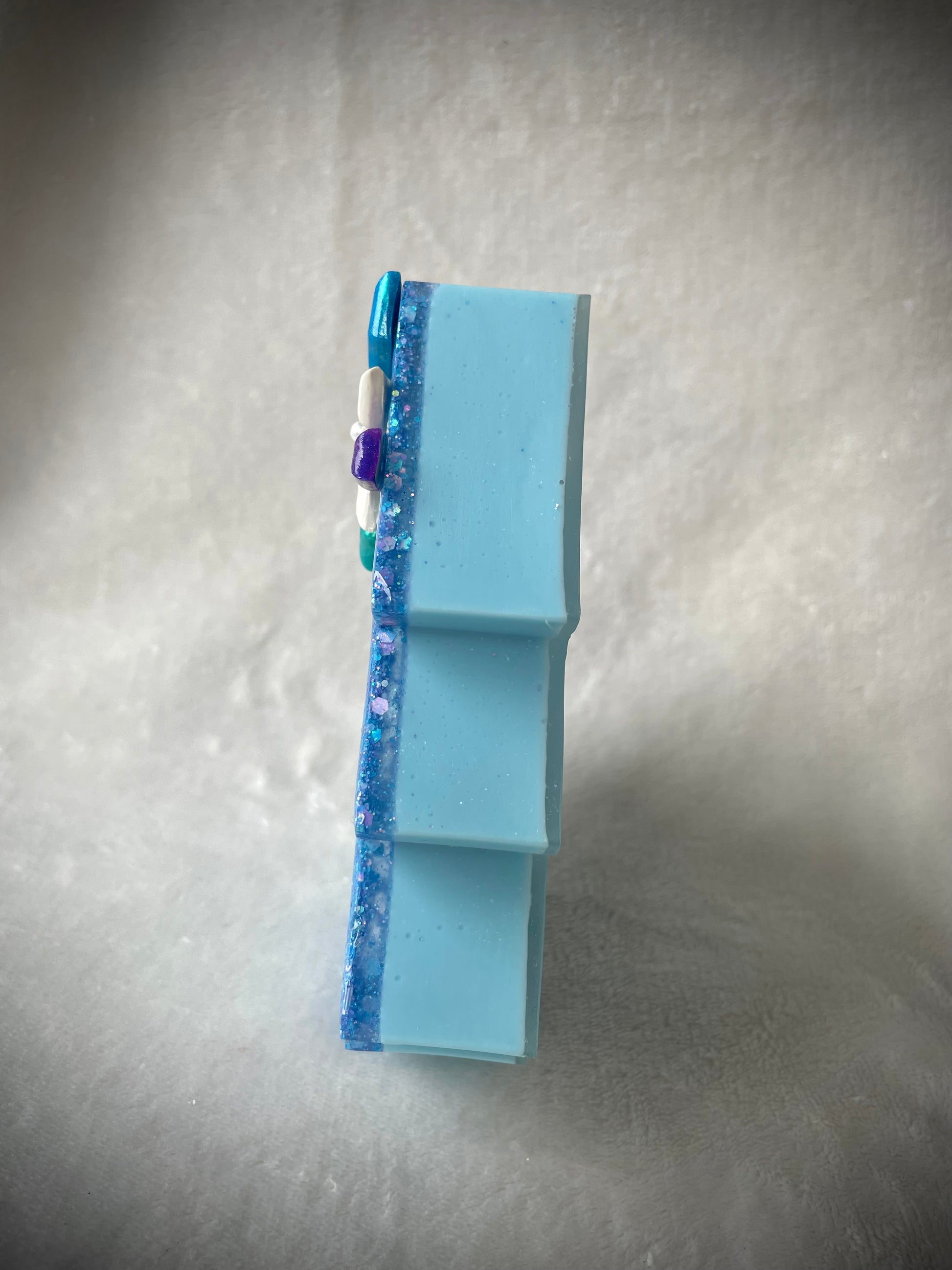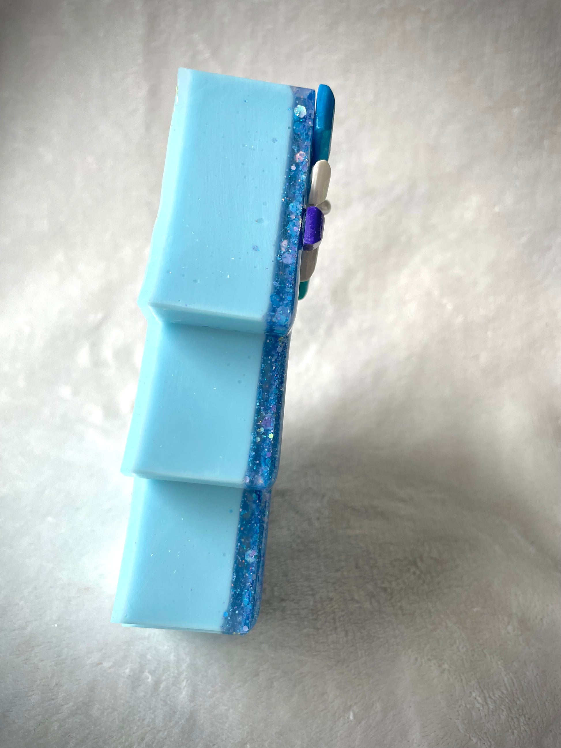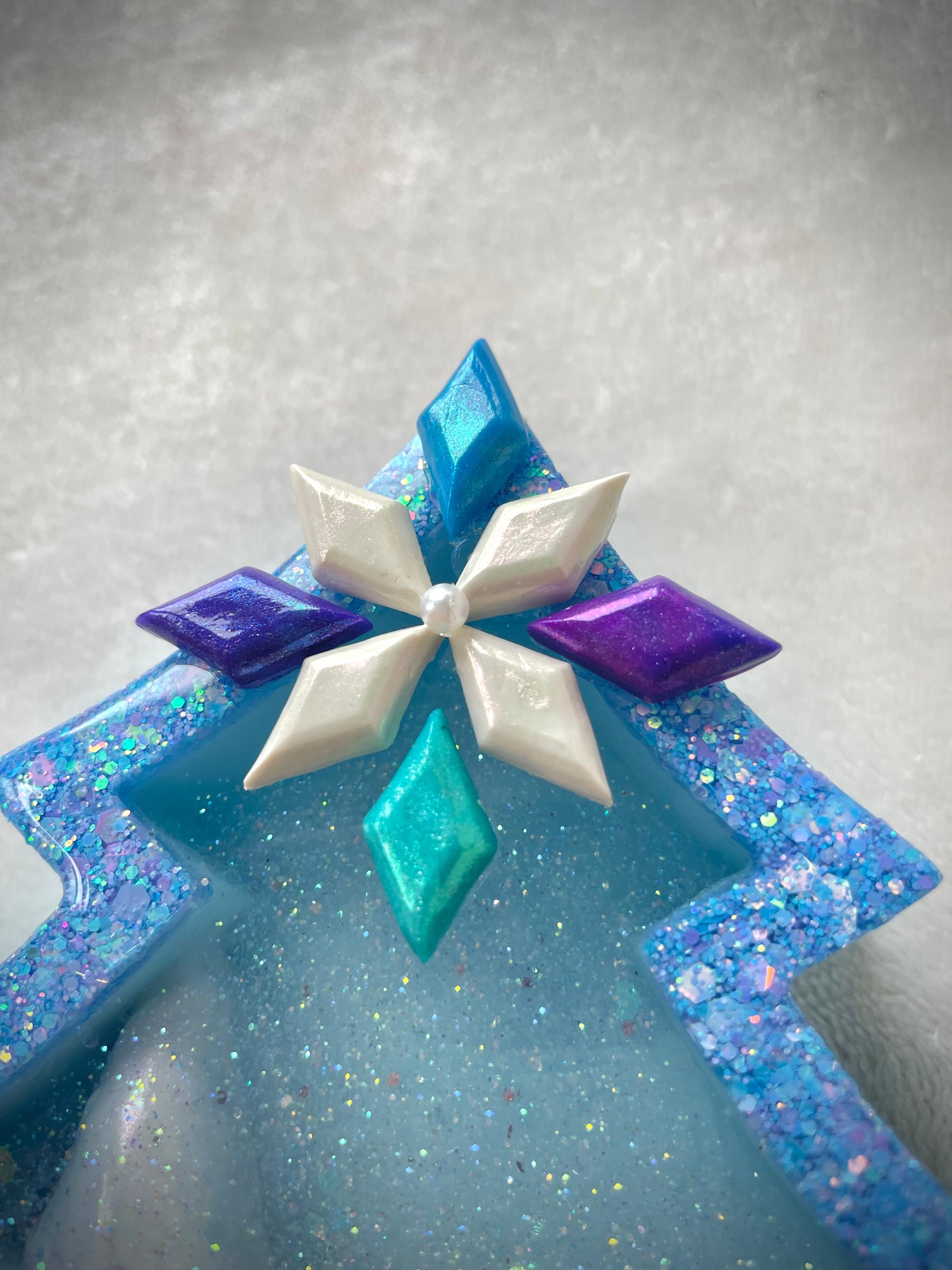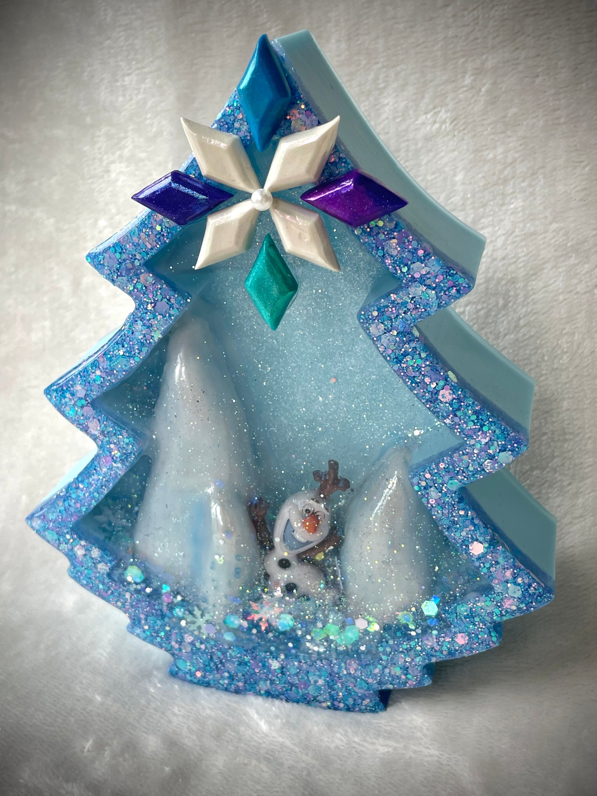 This resin snow globe has pastel blue glitter for the base with a sparkling blue backing. It is filled with handmade snowy hills and Olaf. The snow flake topper is handmade from polymer clay as well.