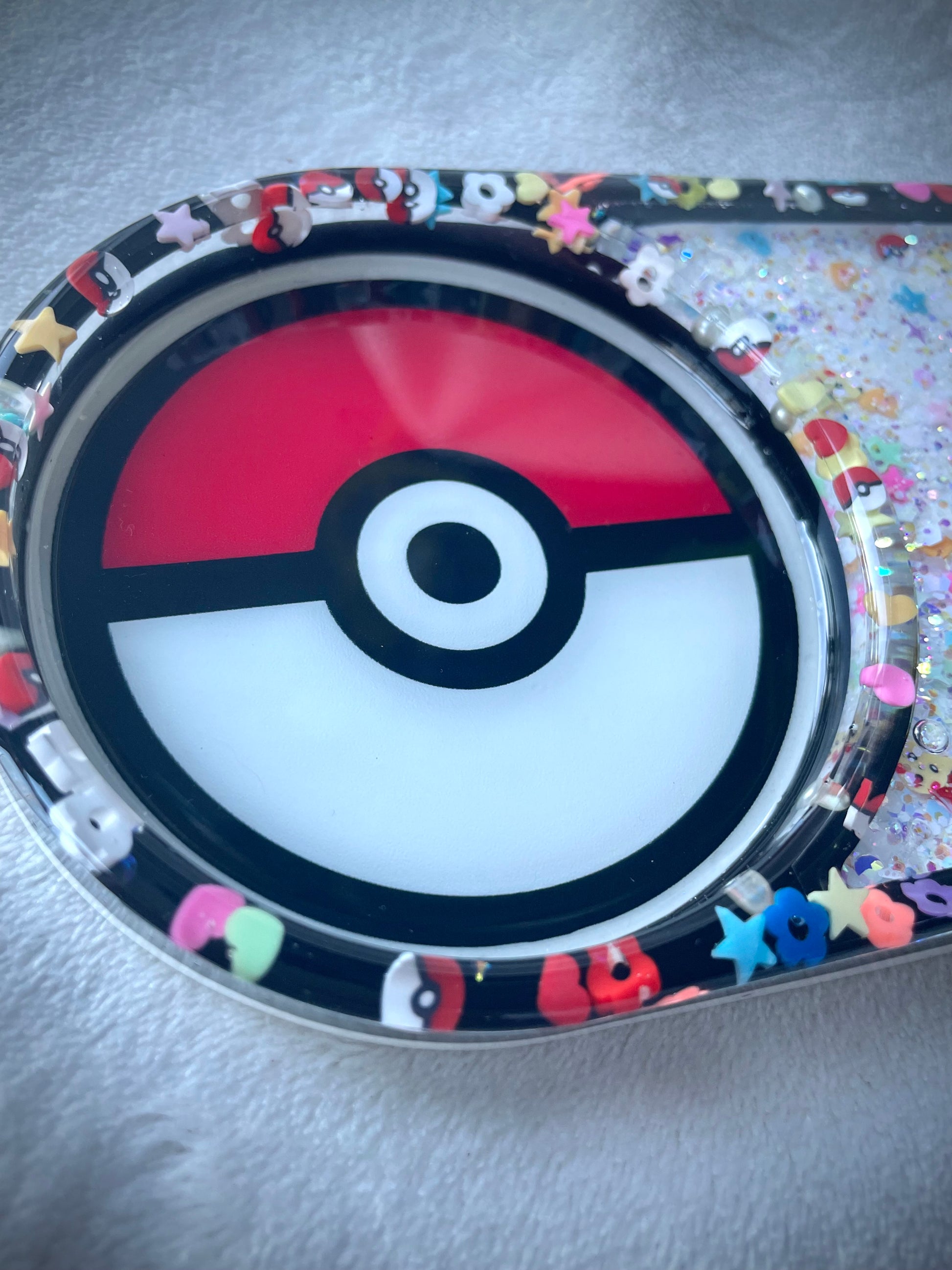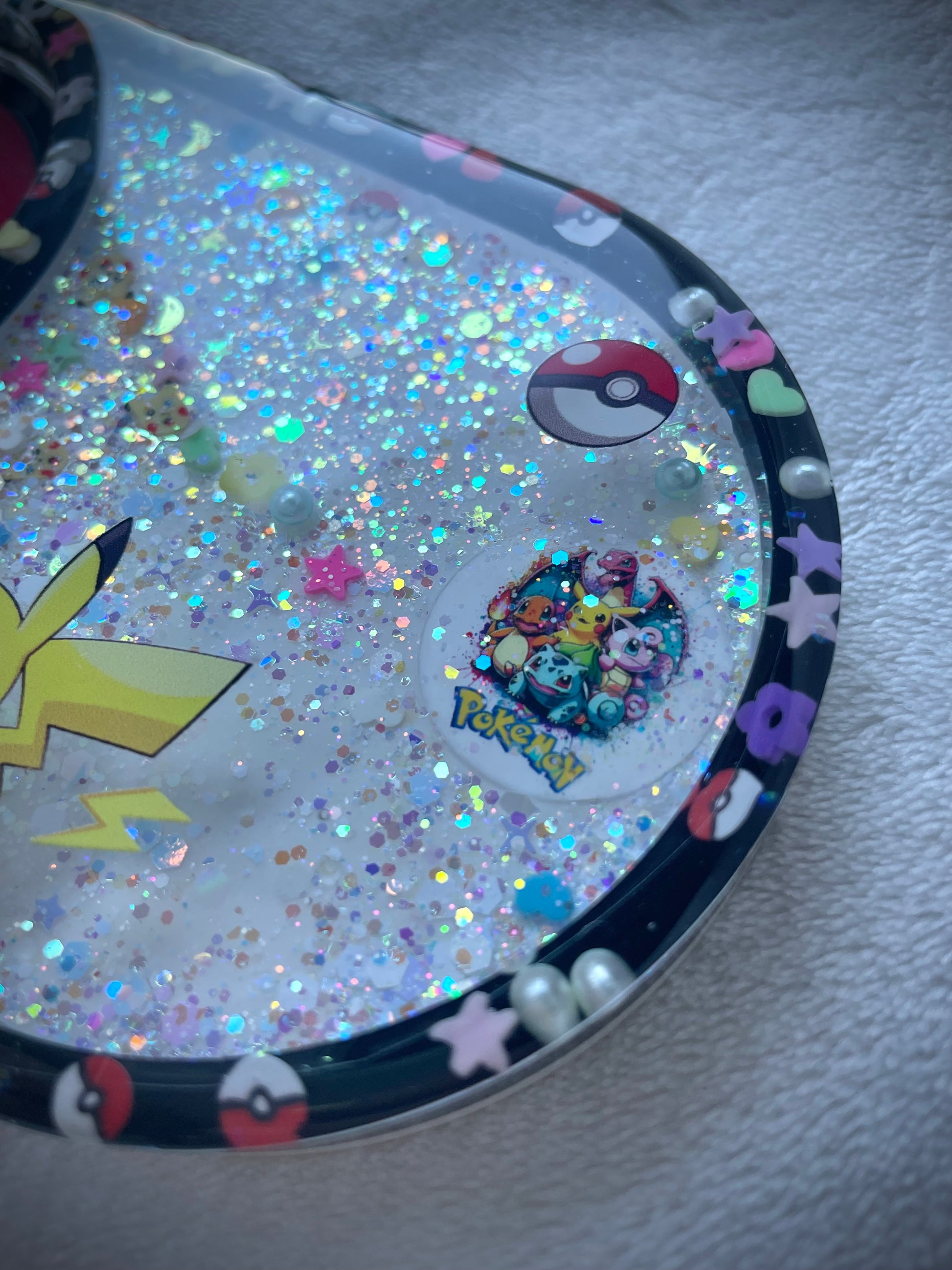 This is a Pokémon themed coaster. Picachu is the main character for this piece. Inside is clay bits, glitter and a large half pearl with more characters.