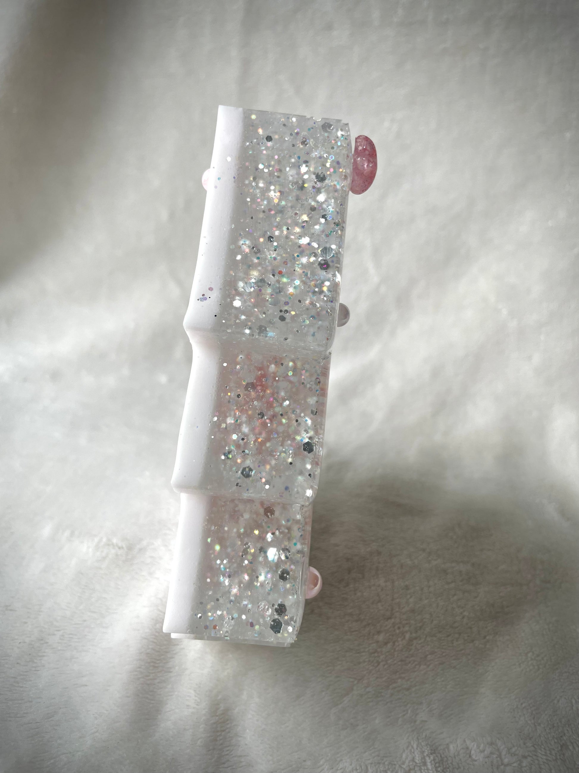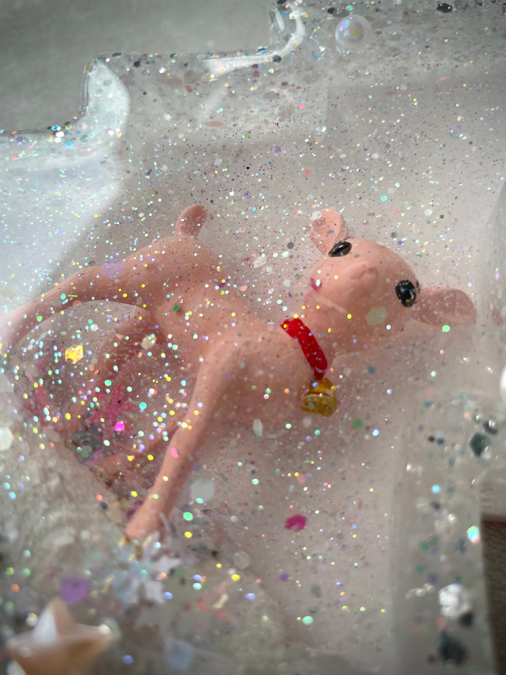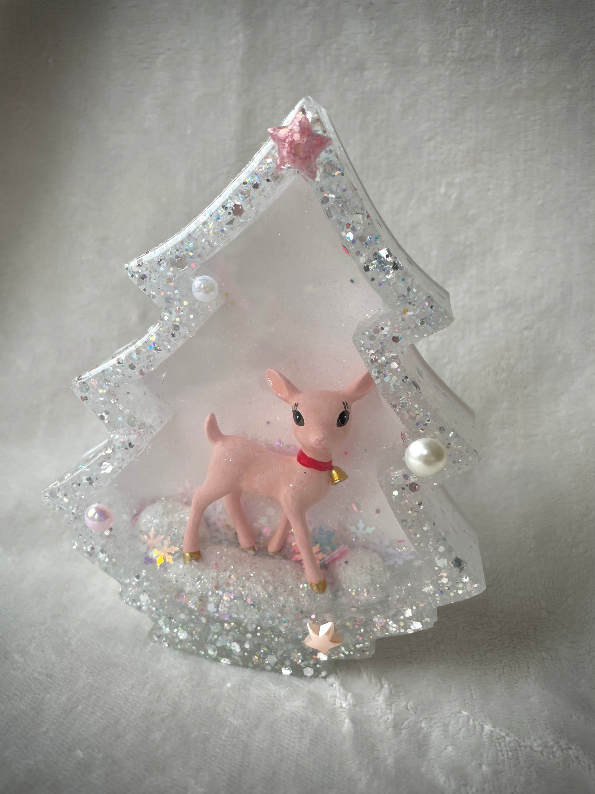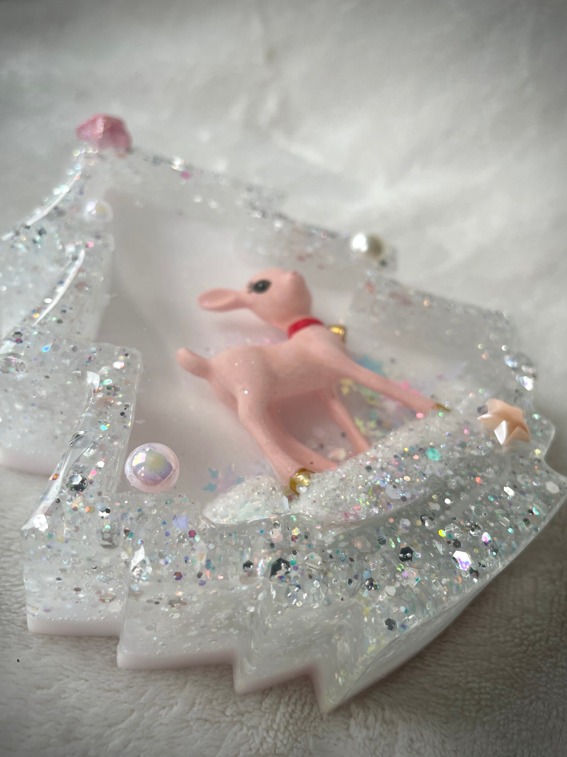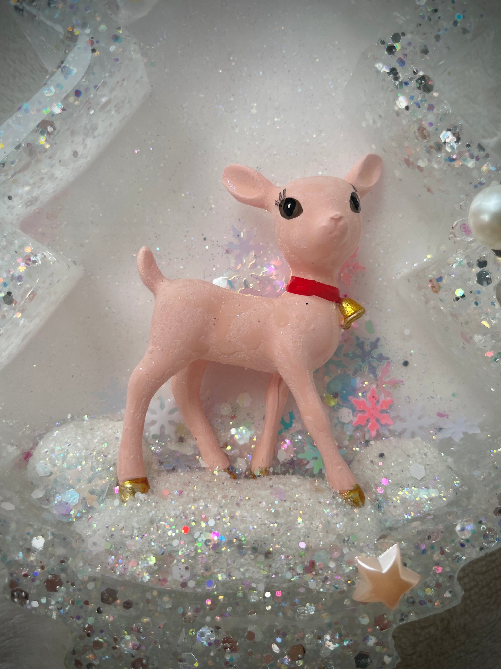 This resin snow globe has iridescent and holographic white and silver glitter for the base with a white backing. It is filled with a polymer clay snowy base and a resin deer. The shaker bits are glitter and rainbow snowflakes.